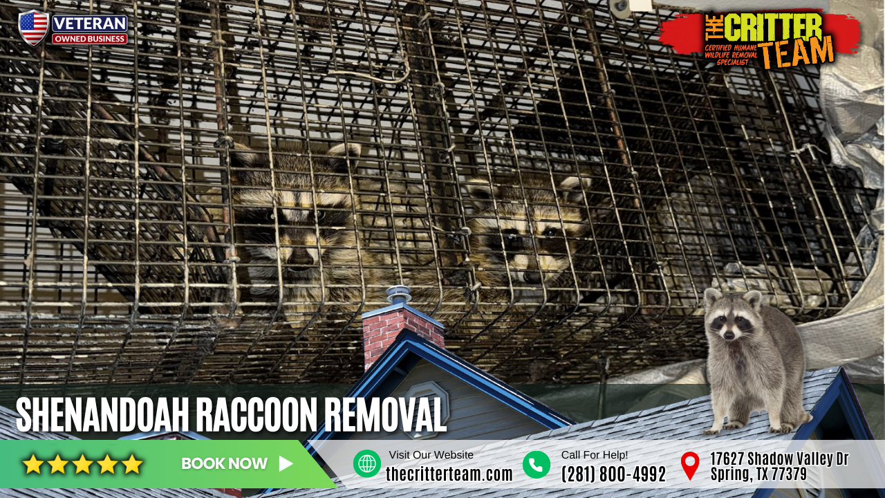 The Critter Team’s removes numerous raccoons from Texas homes and businesses. Raccoons are clever animals among Houston wildlife that easily adapt to urban environments. They love to dig in yards, sift through garbage cans and engage in mischievous behavior as they search for food and lodging. Humane animal capture and raccoon removal in Shenandoah Texas is vital if you don’t want raccoons in your attic, under your porch or in your garage. The Texas Animals are known for inflicting extensive damage to property and contaminating homes, businesses and industrial facilities. Call The Critter Team right away to schedule professional raccoon control services with our control operators. The wildlife damages HVAC ductwork, contaminate insulation, destroy attic vents, which lead to expensive damage repairs and TX animals also spread communicable diseases.